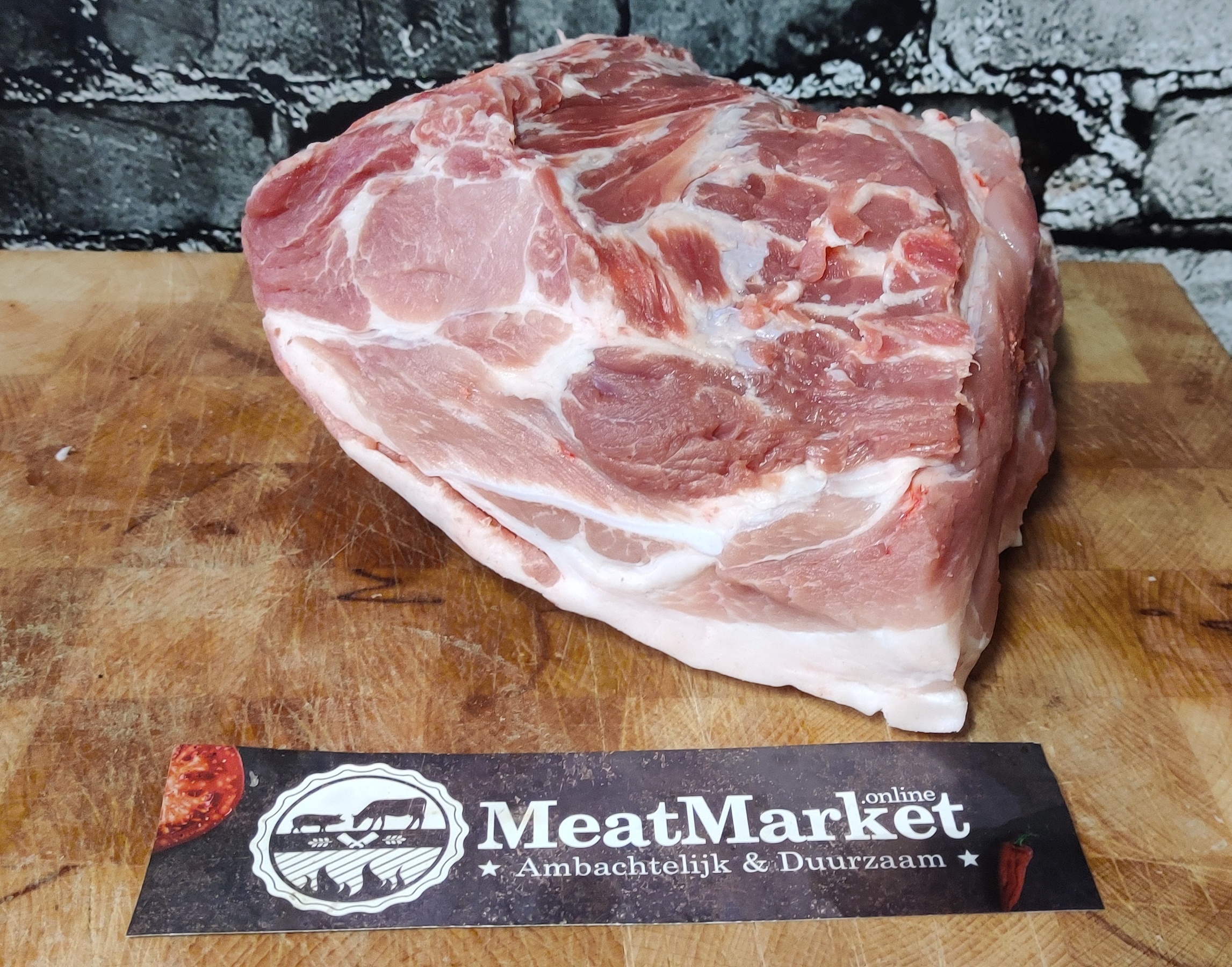 Deze Boston Butt is gemaakt van Brasvar duroc varken uit Nevele. Brasvar staat voor duurzaam geproduceerd varkensvlees.  Een dikke money mussle zit in deze boston butt omdat deze varkens wat meer wegen dan normale varkens. Topstuk voor de echte BBQ pitmaster. het schouderblad zit hier nog in. Originele USA cutt.