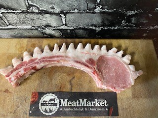 Prachtig stukje vakwerk van onze slagers. Een stoere punk kotelet met hanenkammen. Pronkstuk voor iedere BBQ. Grill deze op hoge temperatuur zo’n 5 minuten en laat dan nog even rusten voordat u uw tanden erin zet. Beetje Keltisch zeezout en wat peper uit de molen is voldoende voor dit heerlijke vlees.